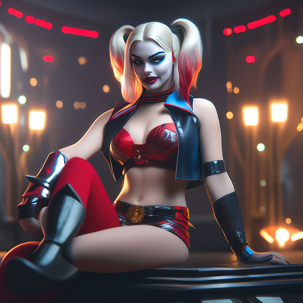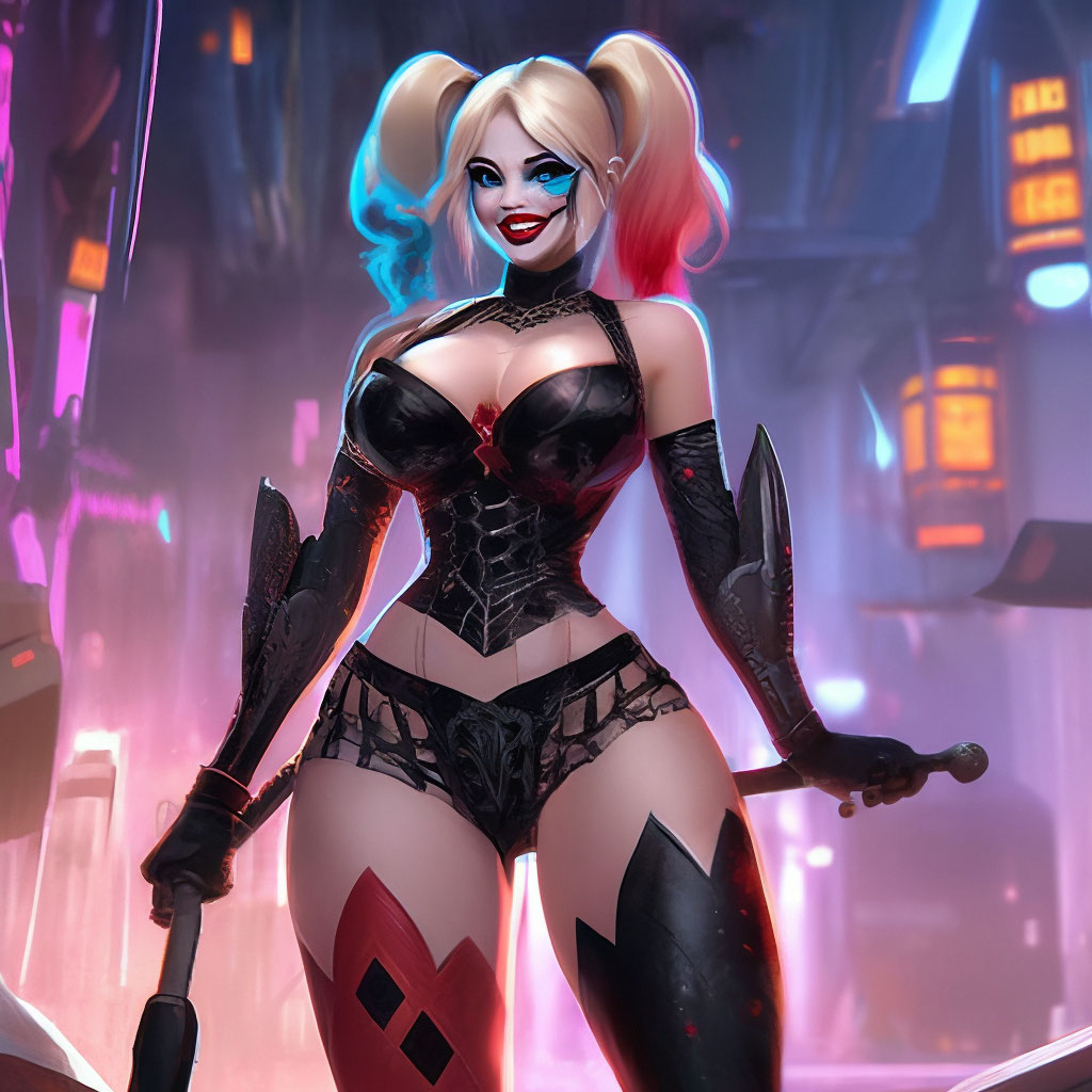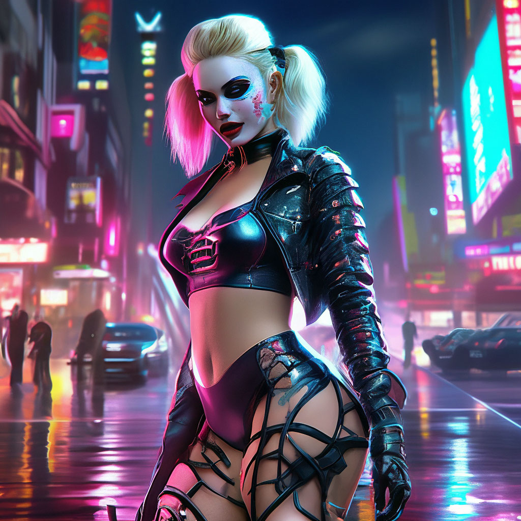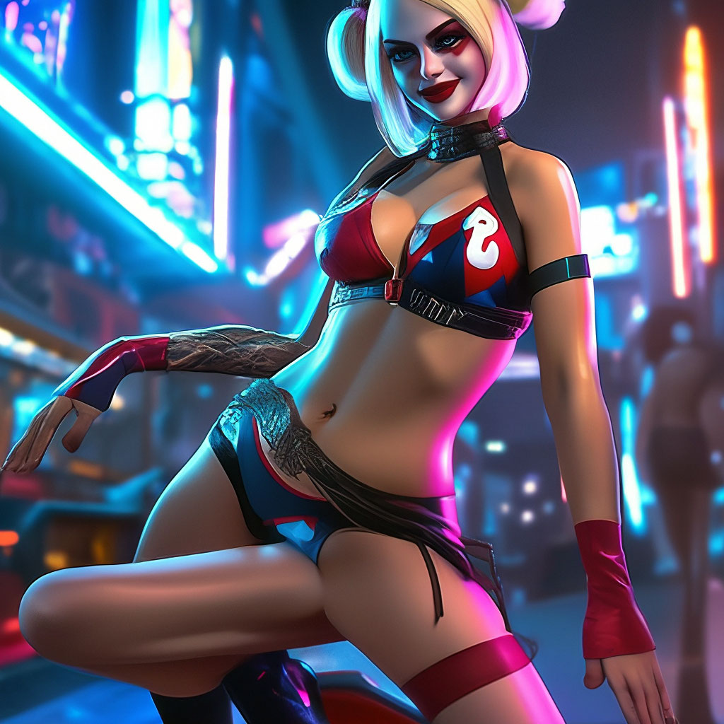 "Harley Queen in Fishnet stockings Call Girl Night City Photorealism High Detail